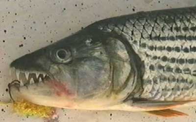 aanval. Bij het binnendraaien werd mijn kunstaas plots gestopt en volgde er een korte ruk. De bek van de tijgervis is echter zo hard dat